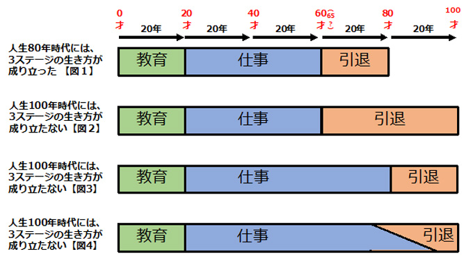 しかし人生100年の時代になると、「教育(20年)→仕事(40年)→引退(40年)」という形で3つのステージを生きて行くのは難しいでしょう(図2)。